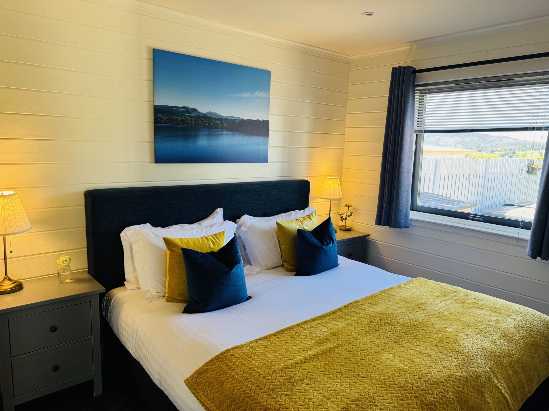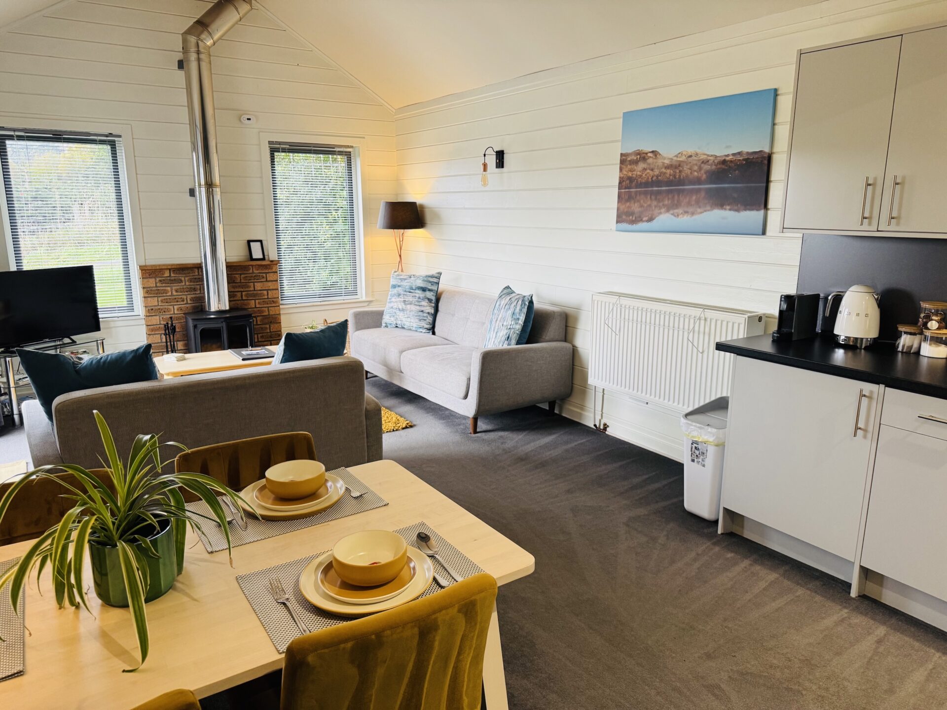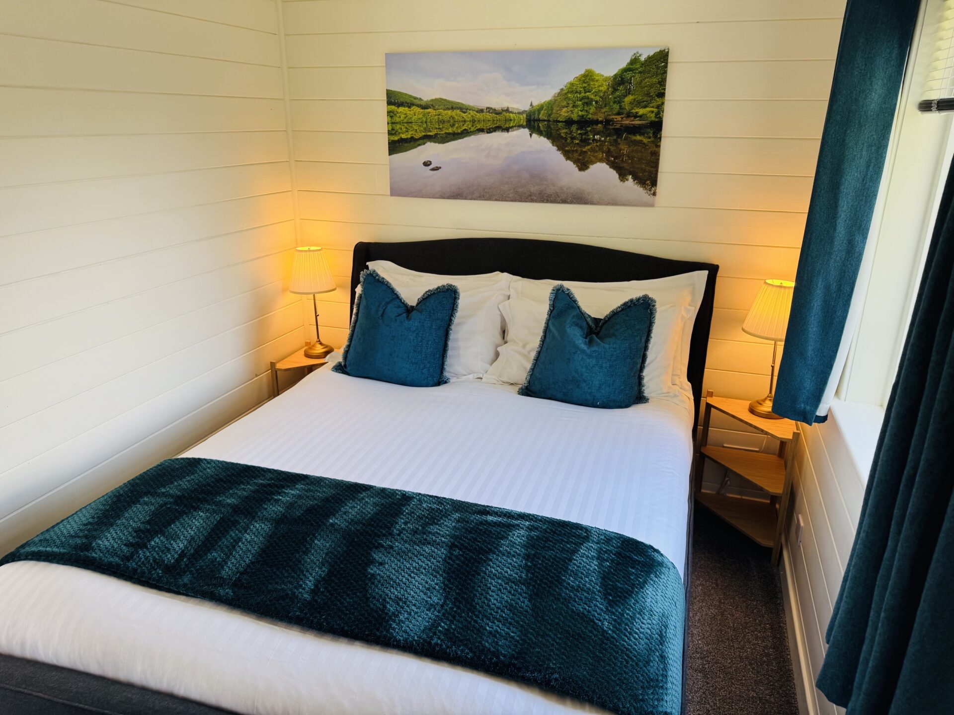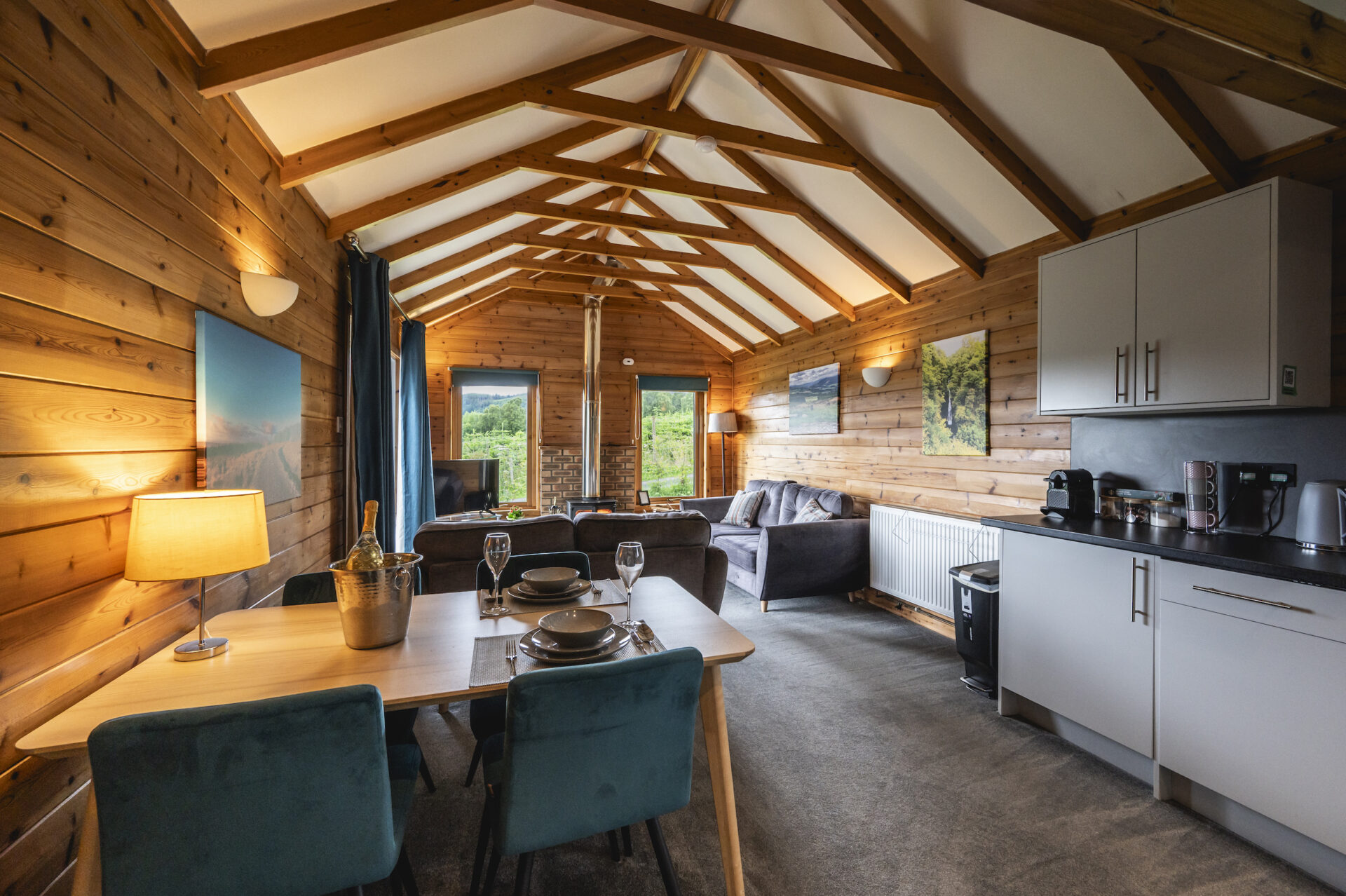 Our luxury one bedroom pine lodges are cosy properties with woodburner and vast windows revealing the picturesque Pitlochry landscape. This cosy woodland lodge is complete with an open plan living, dining and kitchen area and en-suite shower room. Beinn A’ Ghlo has a teal and orange tartan theme throughout. Beinn A’ Ghlo has it’s own private hot tub outside on it’s decking looking over the beautiful views.